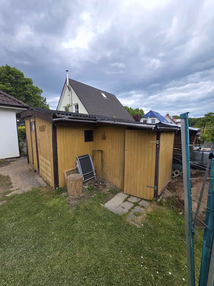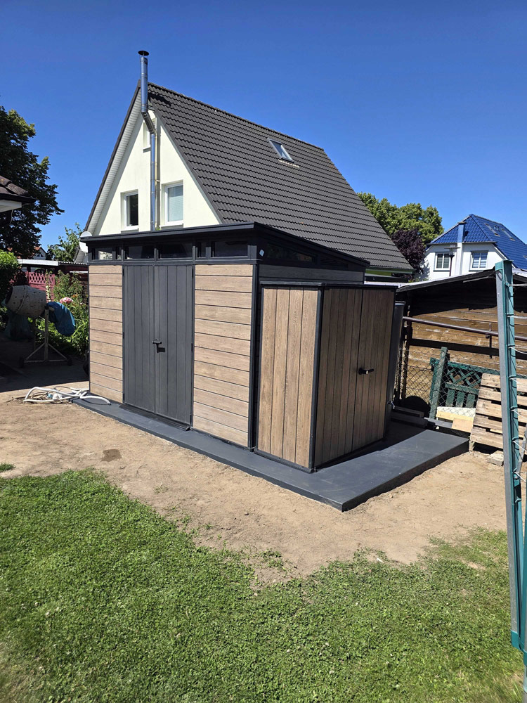 Aus einem verwitterten Schuppen wurde ein stabiles, modern verkleidetes Gerätehaus mit sauberer Basis.