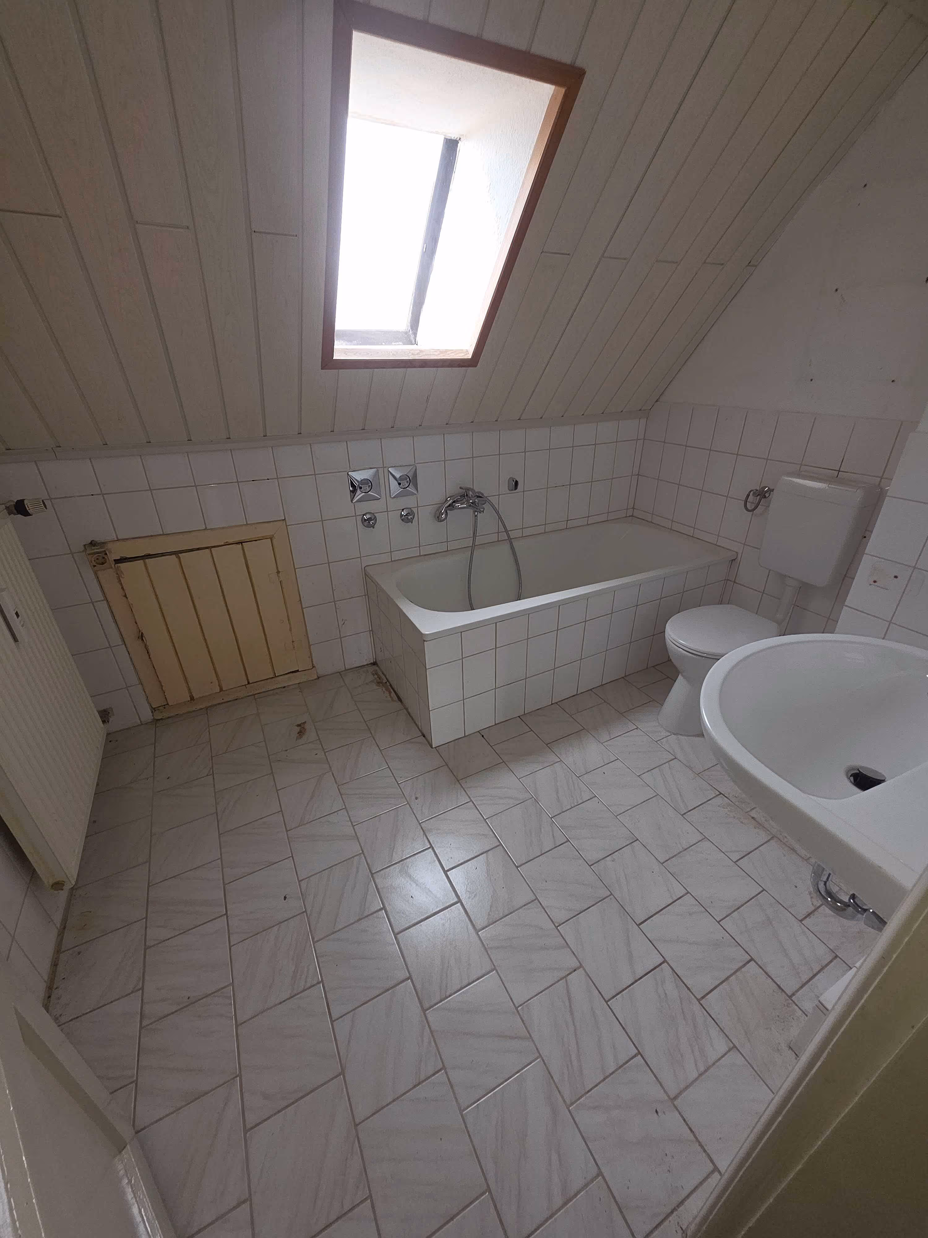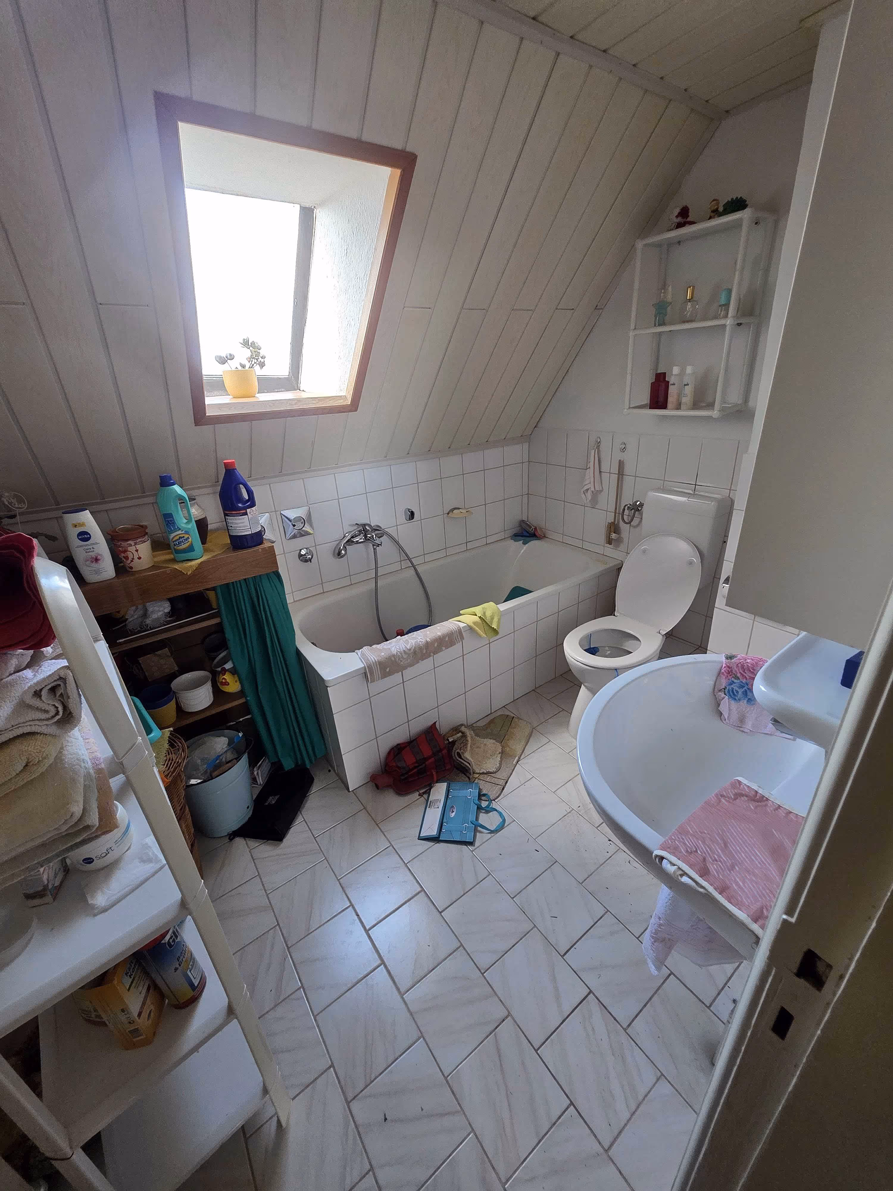 Aus einem überladenen, stark verschmutzten Bad wurde ein hygienisch sauberes, aufgeräumtes Dachgeschoss-Bad.