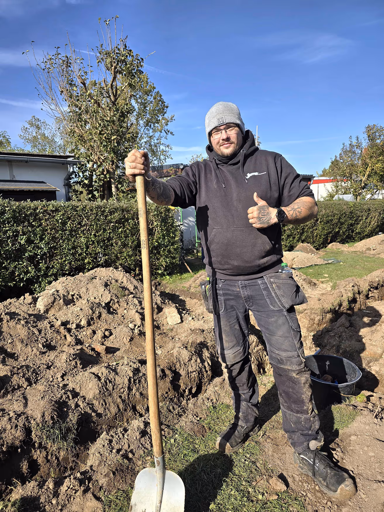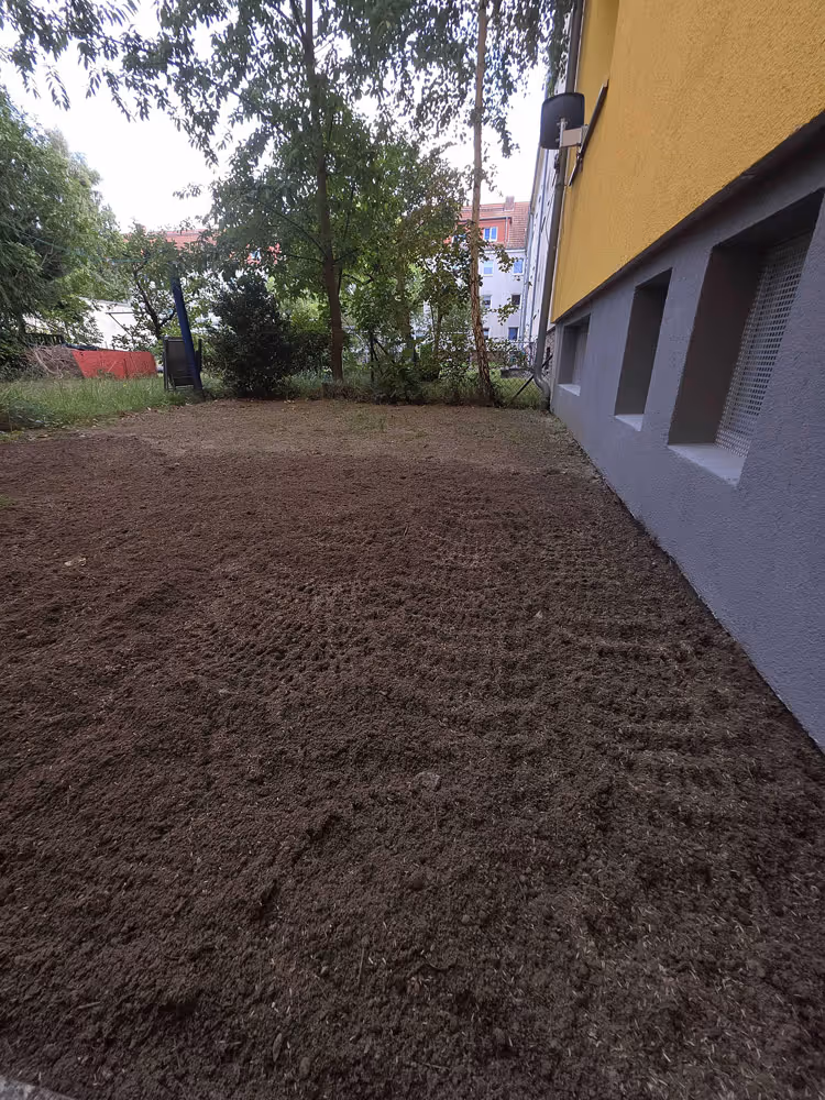 Aus unebenem, verwildertem Boden entstand eine ebene, sauber vorbereitete Fläche – bereit für neuen Rasen und Bepflanzung.